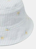 This reversible striped bucket hat is the perfect accessory to protect your baby boy's head from the sun while adding a touch of style to his summer outfits. On one side, it features a light denim blue and white striped face with a patch depicting a beach landscape, evoking a spirit of relaxation and vacation. On the other side, it offers a light blue seersucker face with prints of small suns, bringing a sunny and cheerful ambiance. Versatile and practical, this reversible bucket hat complements all outfits and occasions, ensuring comfort and style throughout the day.